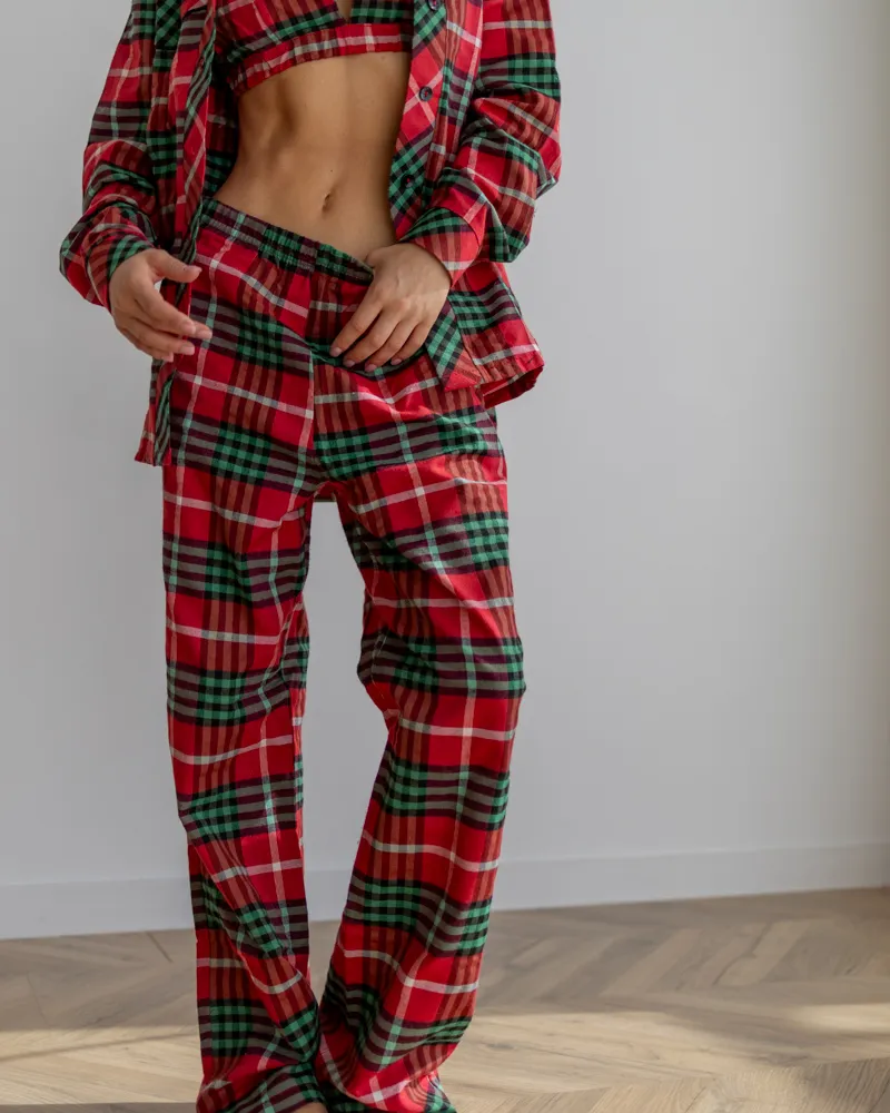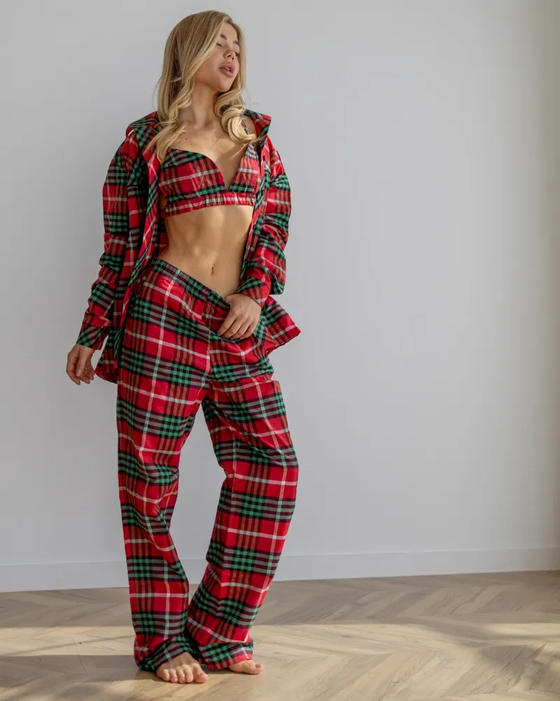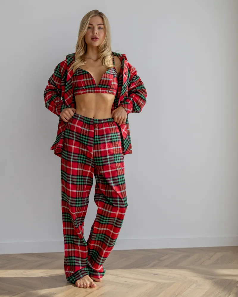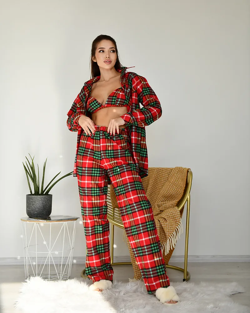 Головна / Каталог / Жінкам / Піжамний костюм / Піжамний костюм трійка з байки Vanessa (Сорочка+Бра+Штани) Червоно-Зелений