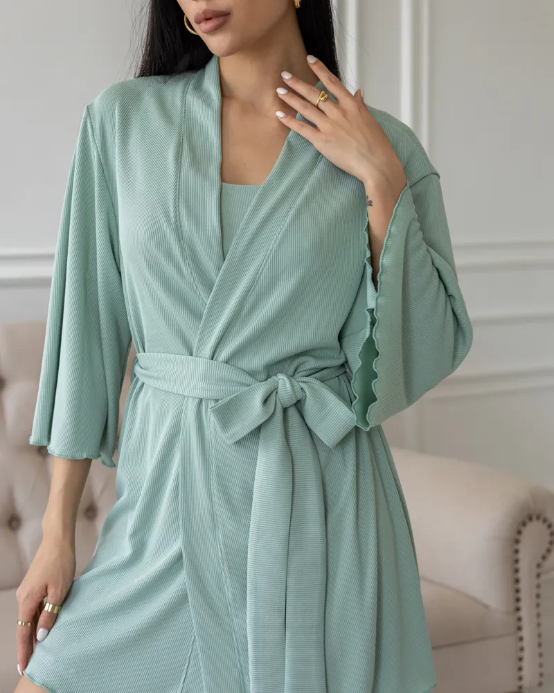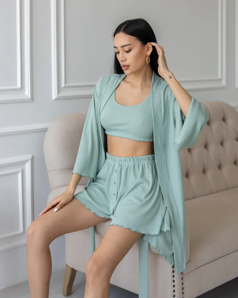 Головна / Каталог / Жінкам / Піжамний костюм / Піжамний костюм трійка з рубчика Dana (халат+топ+шорти) Фісташковий