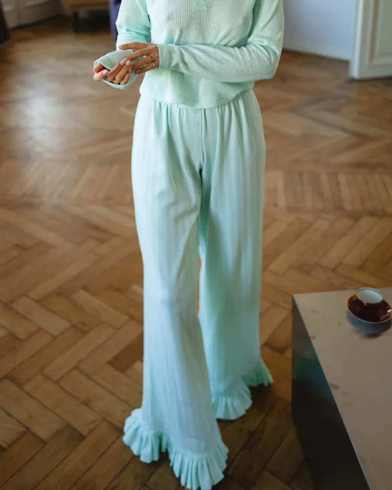 Комплект: лонгслів приталеного крою з V-подібним вирізом, штани вільного крою з рюшами знизу та шорти з розкльошеним силуетом, що красиво підкреслює лінію ніг та додає образу легкості.