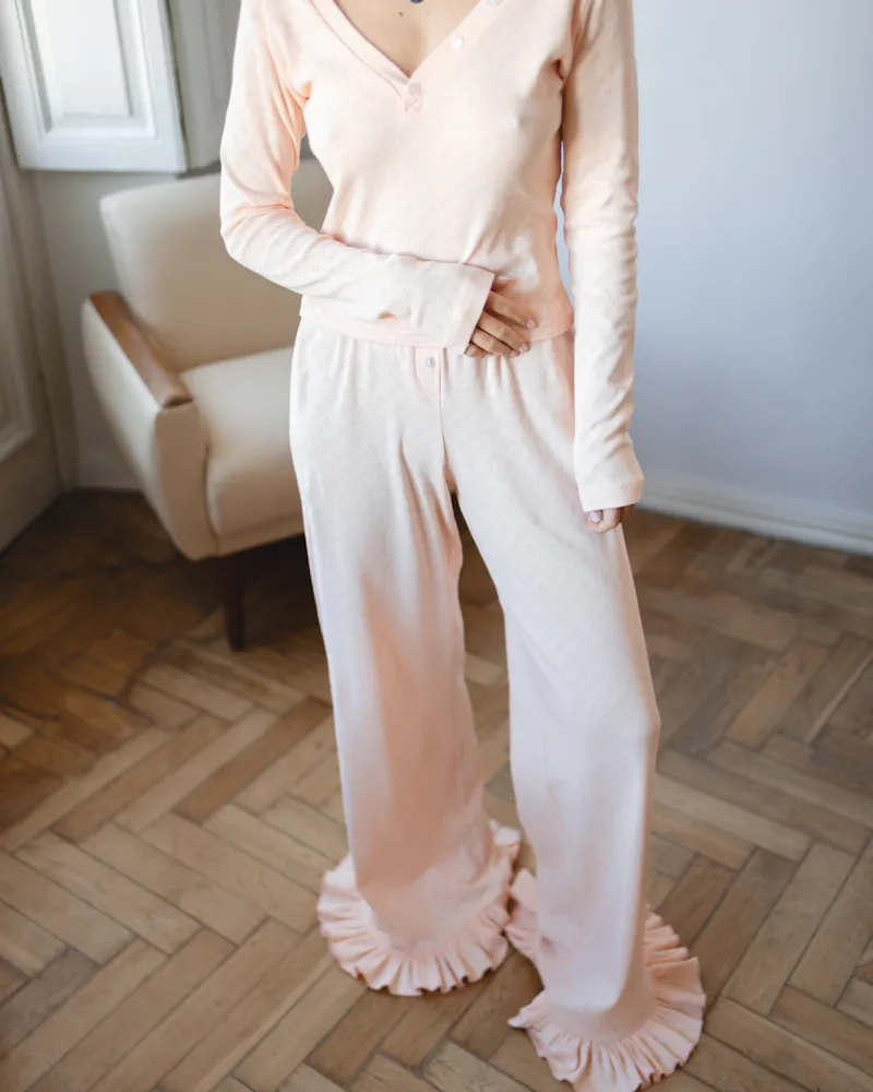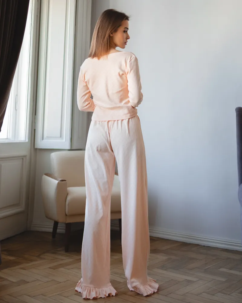 Комплект: лонгслів приталеного крою з V-подібним вирізом, штани вільного крою з рюшами знизу та шорти з розкльошеним силуетом, що красиво підкреслює лінію ніг та додає образу легкості.