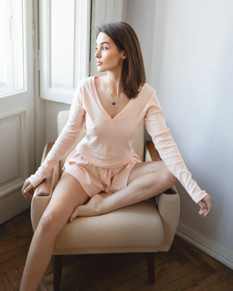 Піжамний костюм-трійка "Nicoletta" (кофта+шорти+штани) тканина трикотаж Персиковий