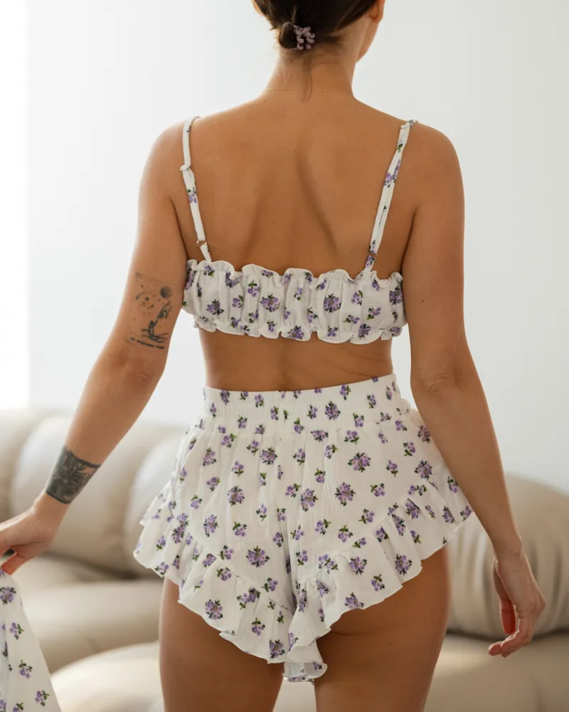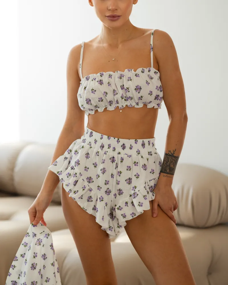 Комплект: короткий халат-кімоно із рюшами на рукавах, зручний топ на резинці та короткі шорти із маленькими рюшами.
