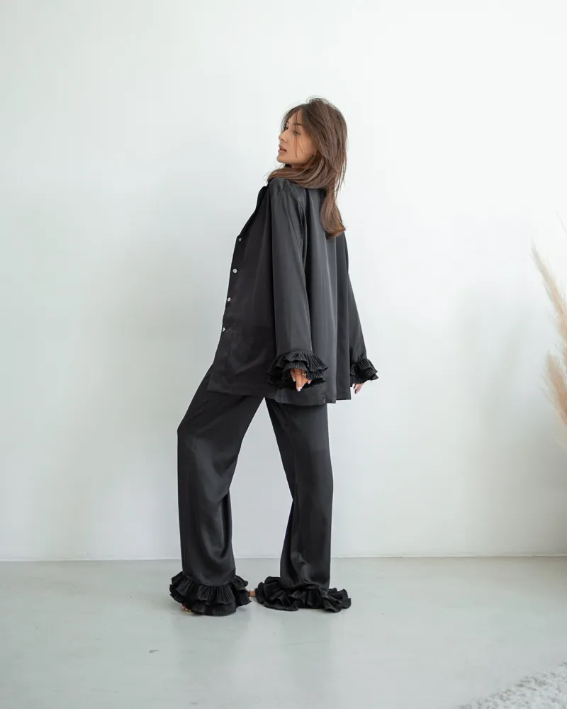 Комплект: довга вільна сорочка на ґудзиках з кишенями + бюстгальтер на застібці + вільні штани з кишенями.Низ рукавів та штанів оздоблено двоярусними рюшами, що додає образу неймовірної легкості та витонченості.