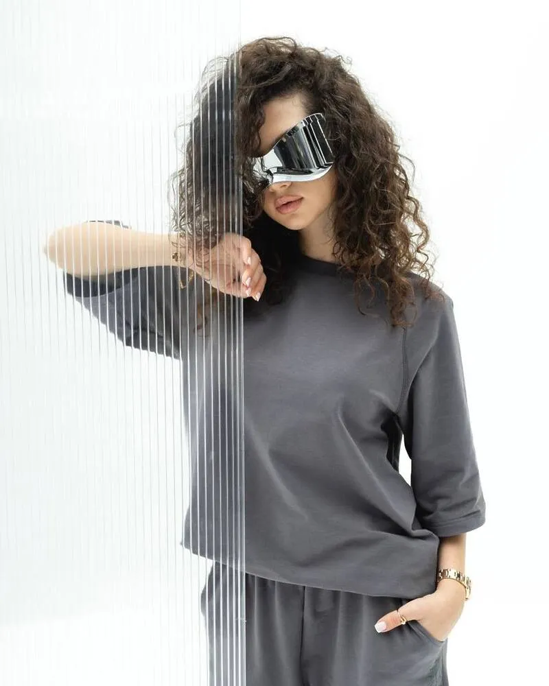 Комплект: футболка із рукавом 3/4 та вільні штани кльош із кишенями.