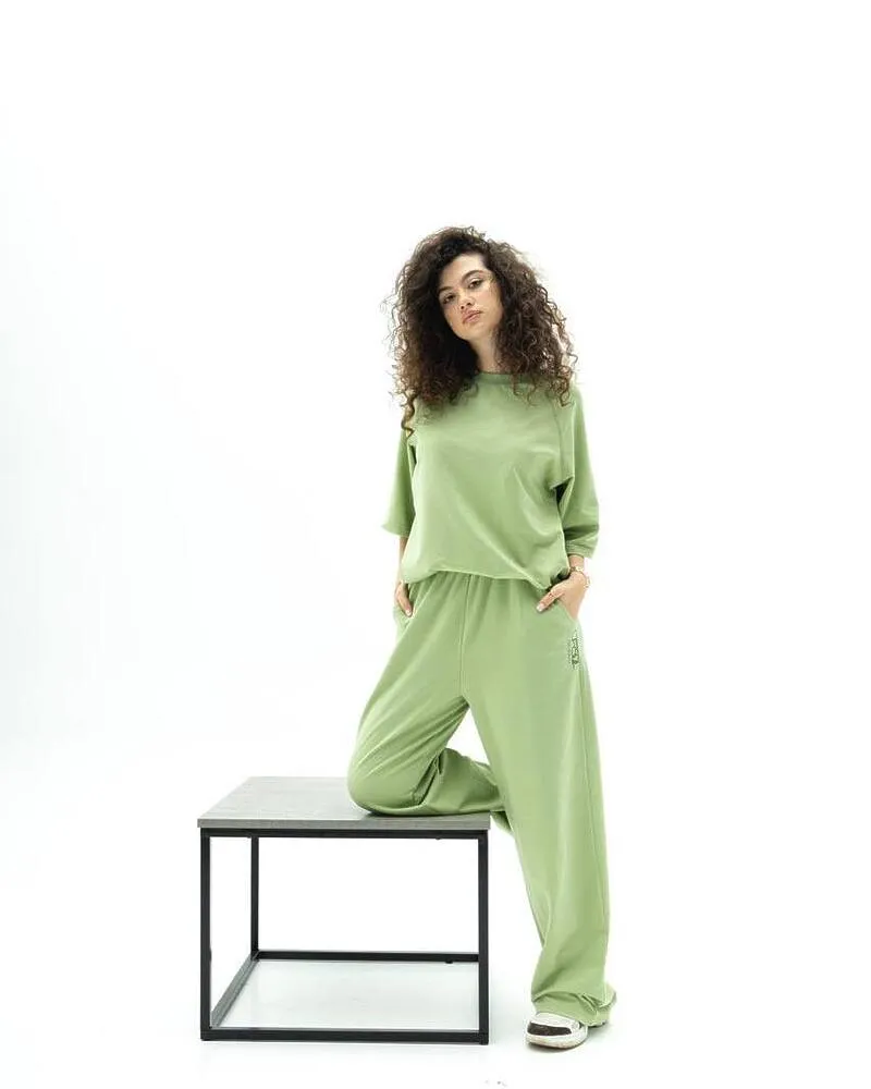 Комплект: футболка із рукавом 3/4 та вільні штани кльош із кишенями.