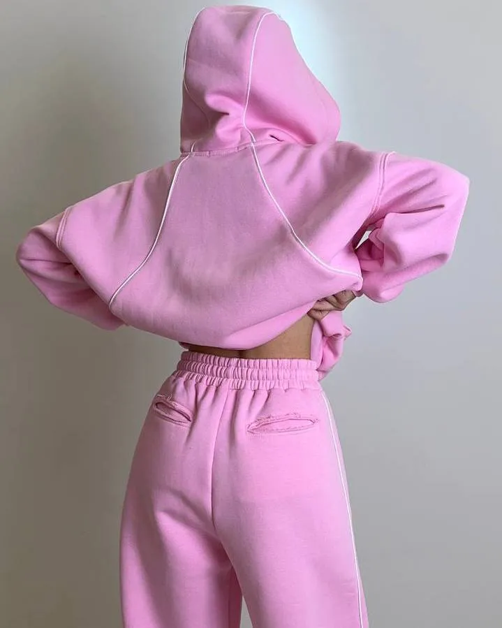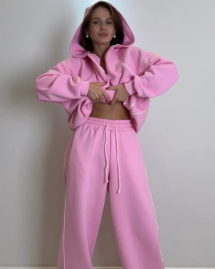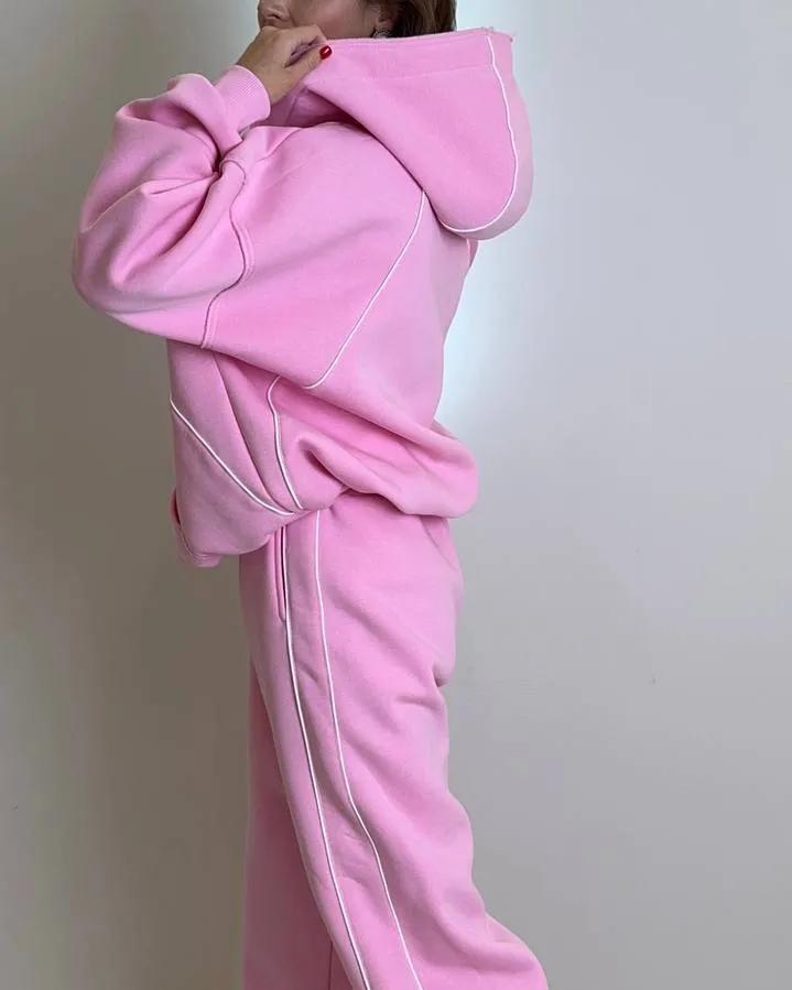 Комплект: вільного крою кофта на блискавці з капюшоном та кишенями, штани-джогери на резинці зі шнурком та кишенями.
