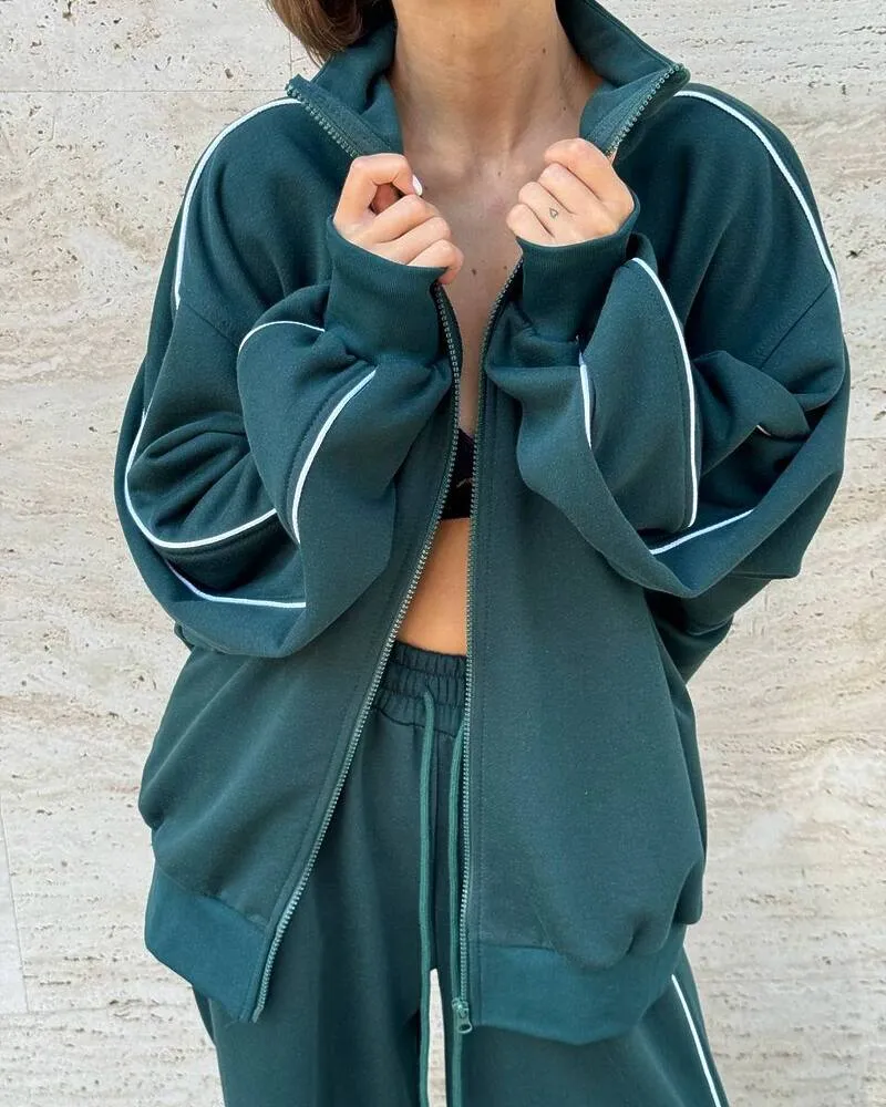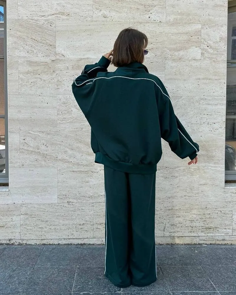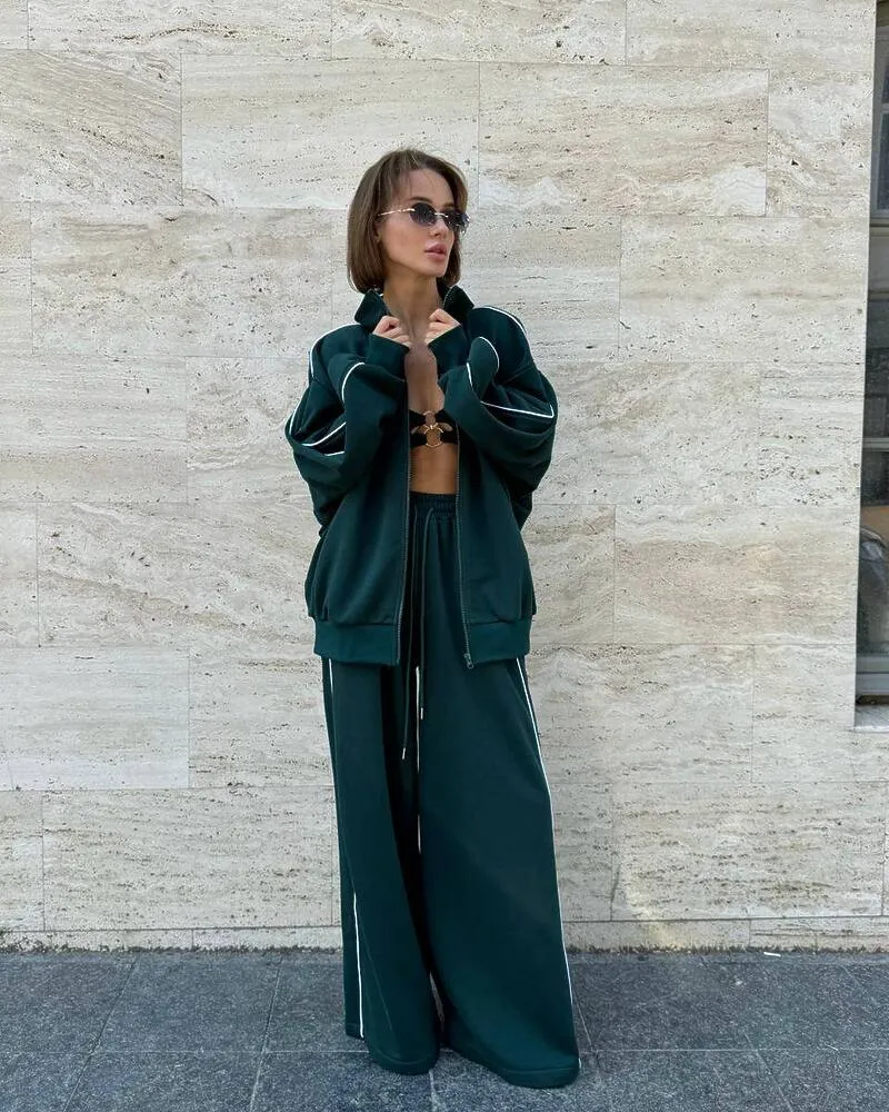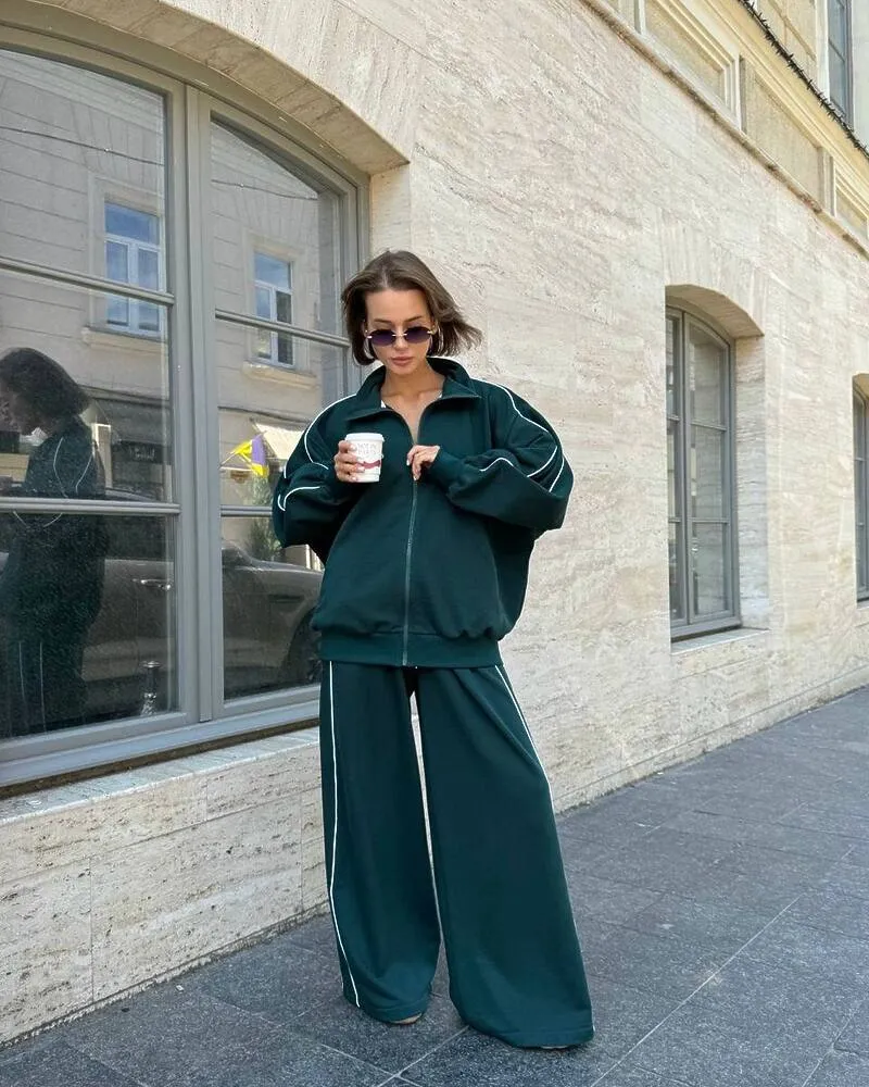 Комплект: вільного крою кофта на блискавці з кишенями та штани-кльош на резинці зі шнурком та кишенями.
