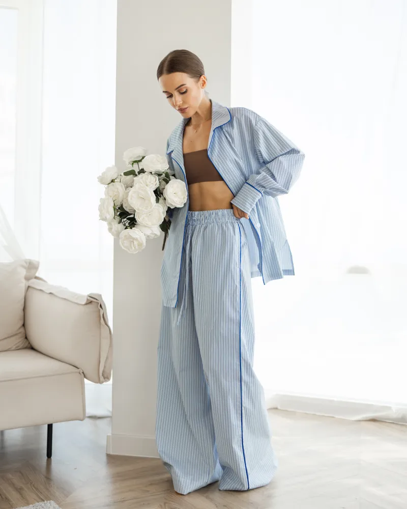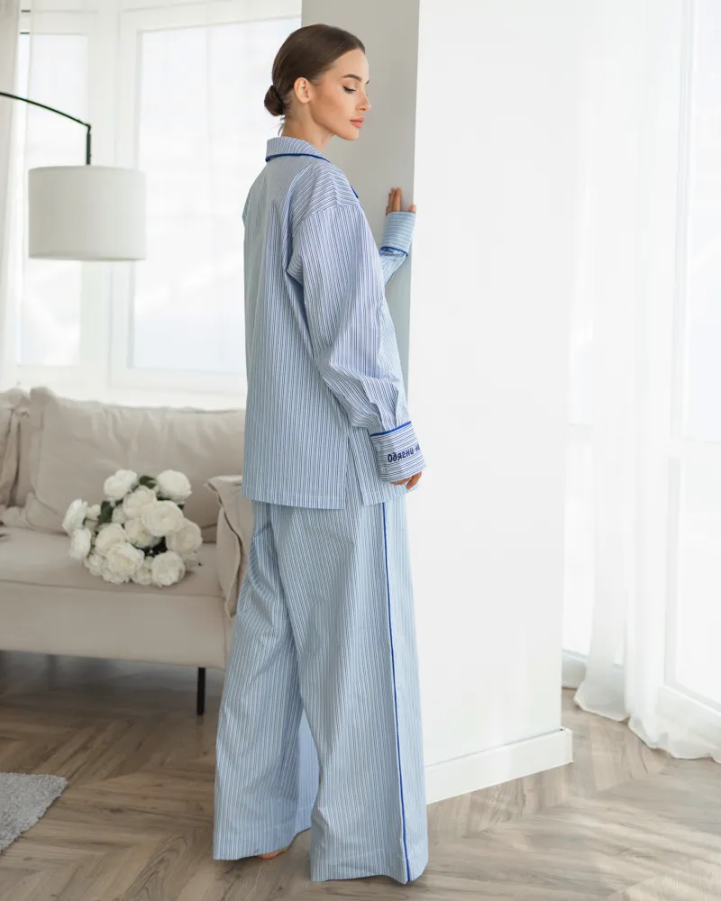 Комплект: довга сорочка із комірцем на гудзиках, рукава із манжетами, на грудях кишеня + вільного крою штани-палаццо з лампасами на резинці зі шнурком та кишенями.