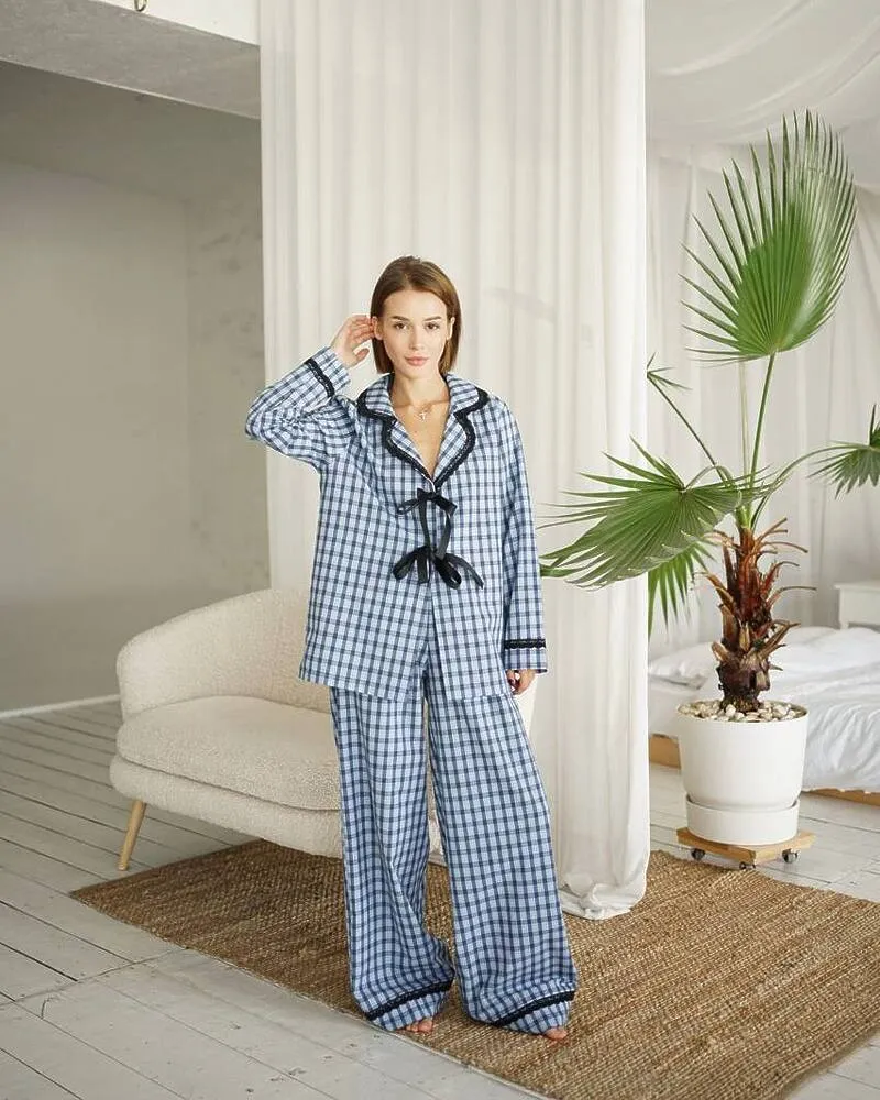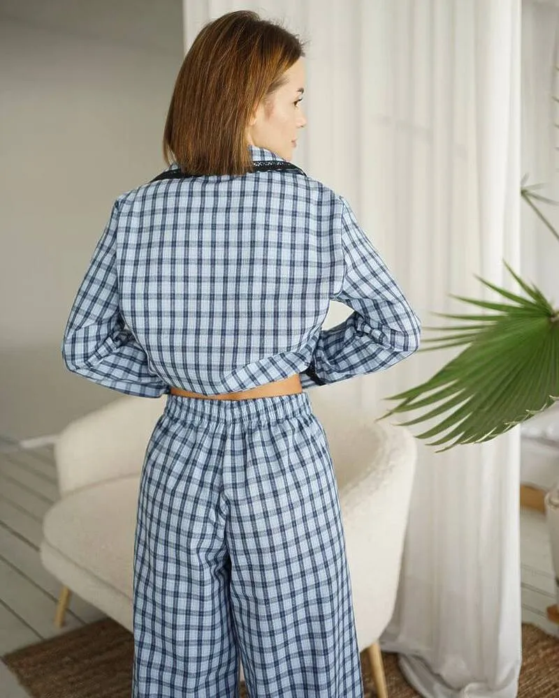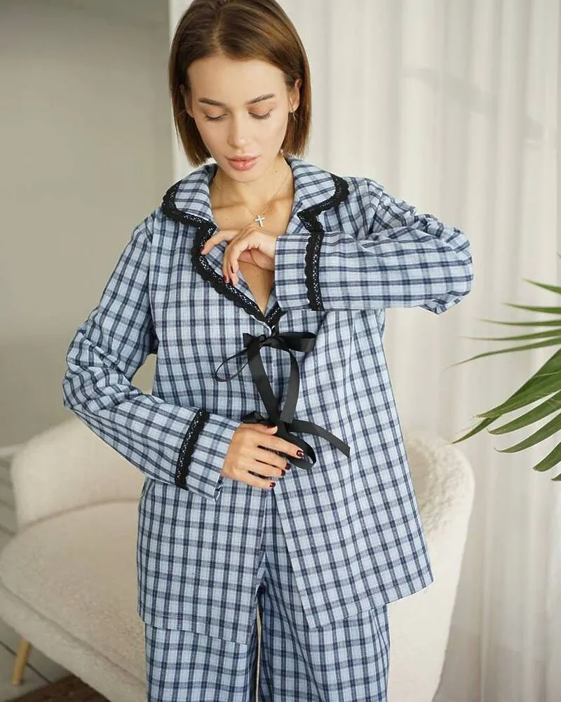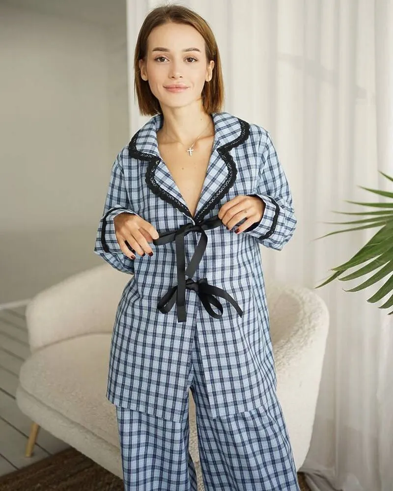 Піжамний костюм у клітинку з якісної турецької тканини байка.Комплект: зручна сорочка на зав'язках з мереживним коміром, штани прямого крою з кишенями на резинці.Тканина байка преміум класу, м'яка, приємна на дотик, не кашлатиться.Піжама ідеально підійде для холодів для дому та сну.