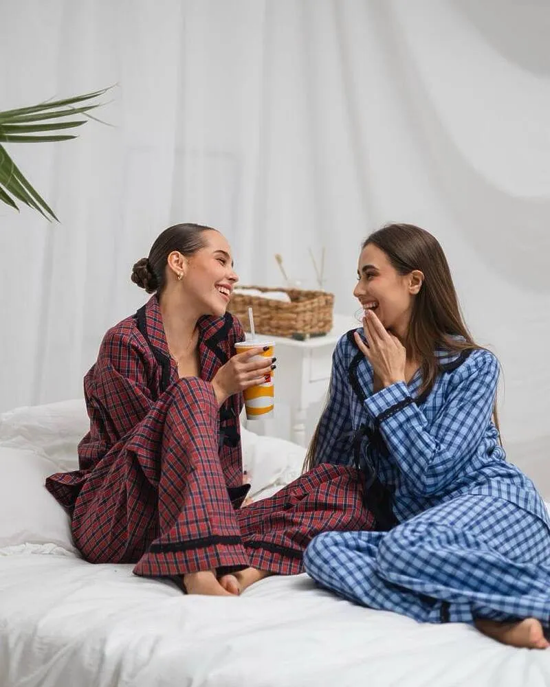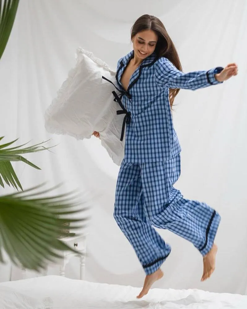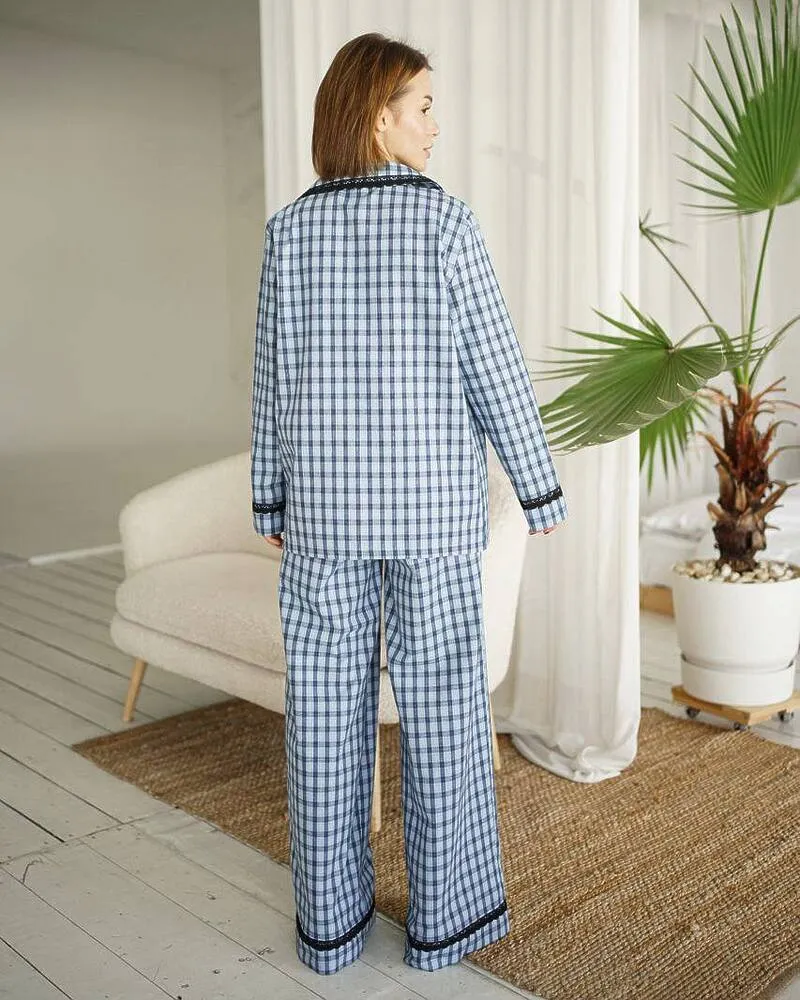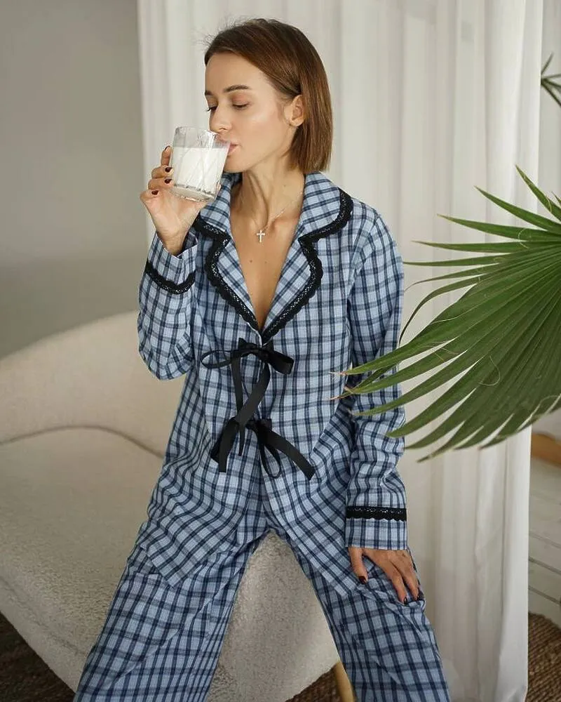 Піжамний костюм у клітинку з якісної турецької тканини байка.Комплект: зручна сорочка на зав'язках з мереживним коміром, штани прямого крою з кишенями на резинці.Тканина байка преміум класу, м'яка, приємна на дотик, не кашлатиться.Піжама ідеально підійде для холодів для дому та сну.