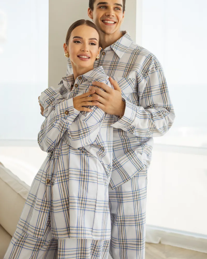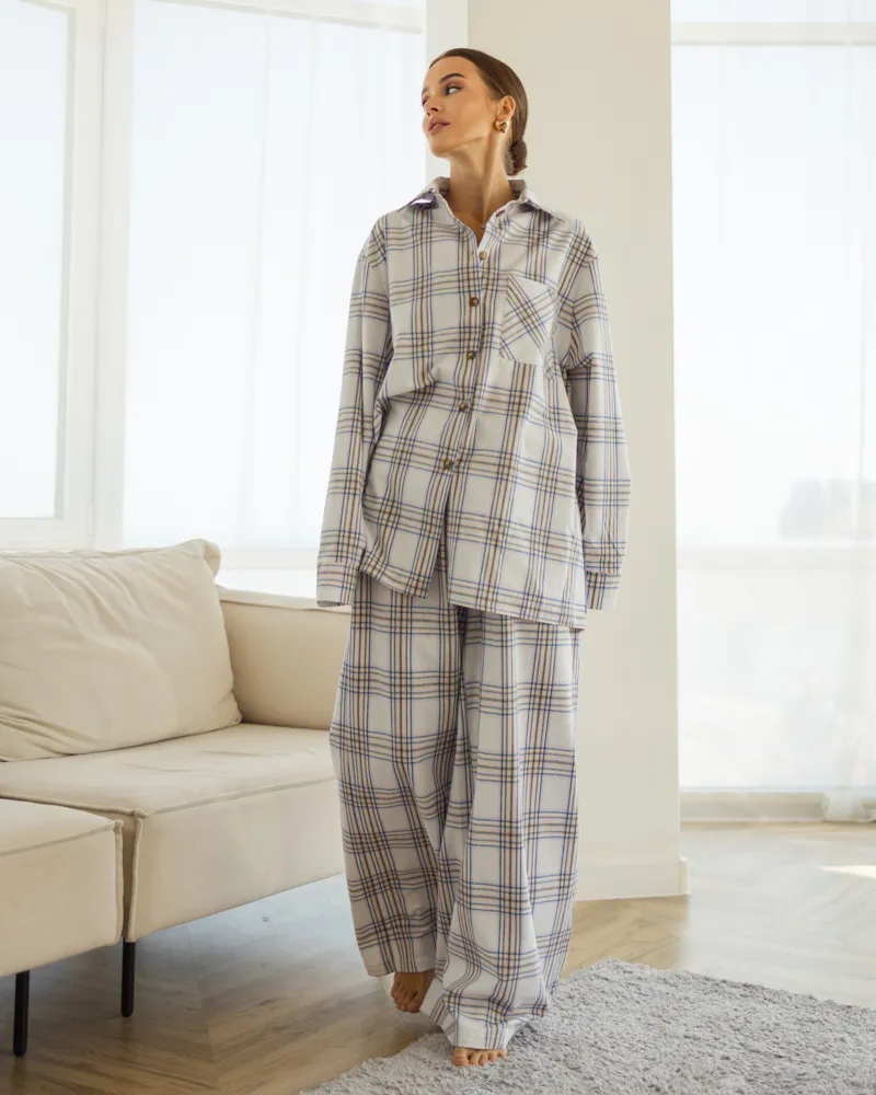 Комплект: довга сорочка на ґудзиках з кишенею, штани вільного крою з кишенями на резинці.