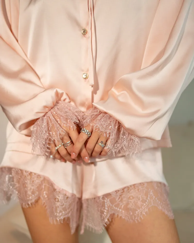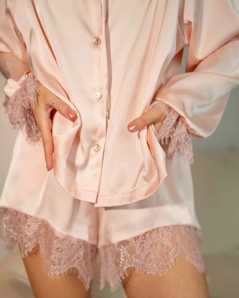 Сорочка вільного крою доповнена мереживним коміром і манжетами, що додають образу ніжності та романтичності. Шорти з еластичним поясом і мереживною обробкою забезпечують комфортну посадку.