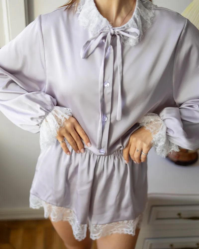 Сорочка вільного крою доповнена мереживним коміром і манжетами, що додають образу ніжності та романтичності. Шорти з еластичним поясом і мереживною обробкою забезпечують комфортну посадку.