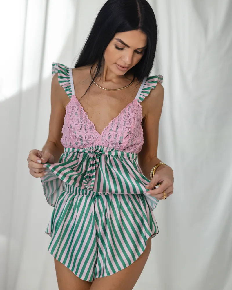 Головна / Каталог / Жінкам / Жіноча піжама / Жіноча піжама "Nora" шовк Армані + мереживо Зелено-рожевий