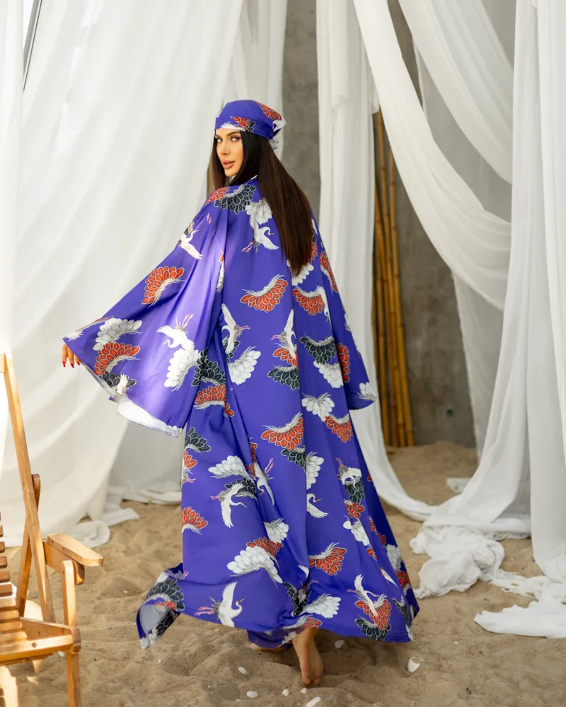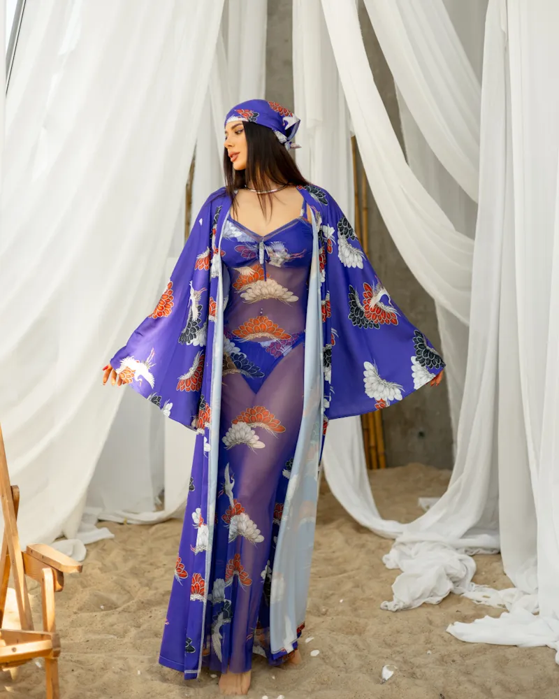 Стильний комплект із італійського шовку: довгий халат-кімоно, витончений купальник та косинка.