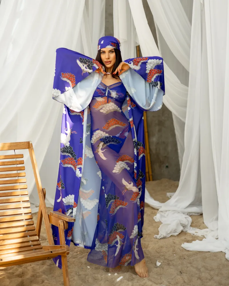 Головна / Каталог / Жінкам / Жіночий костюм / Жіночий комплект "Tropicana" (кімоно-купальник-косинка) тканина італійський шовк Синій