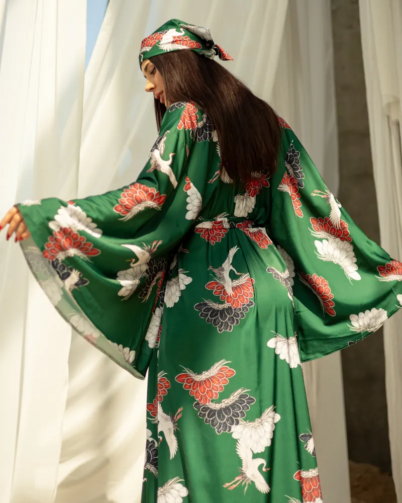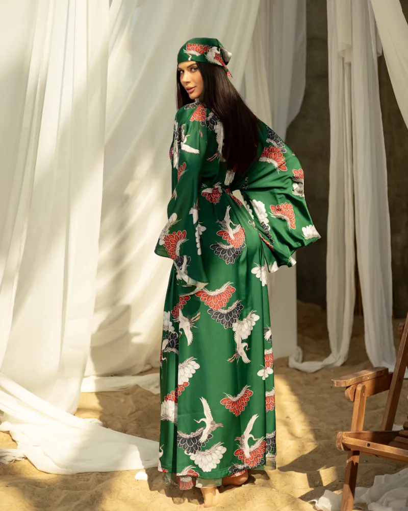 Стильний комплект із італійського шовку: довгий халат-кімоно, витончений купальник та косинка.