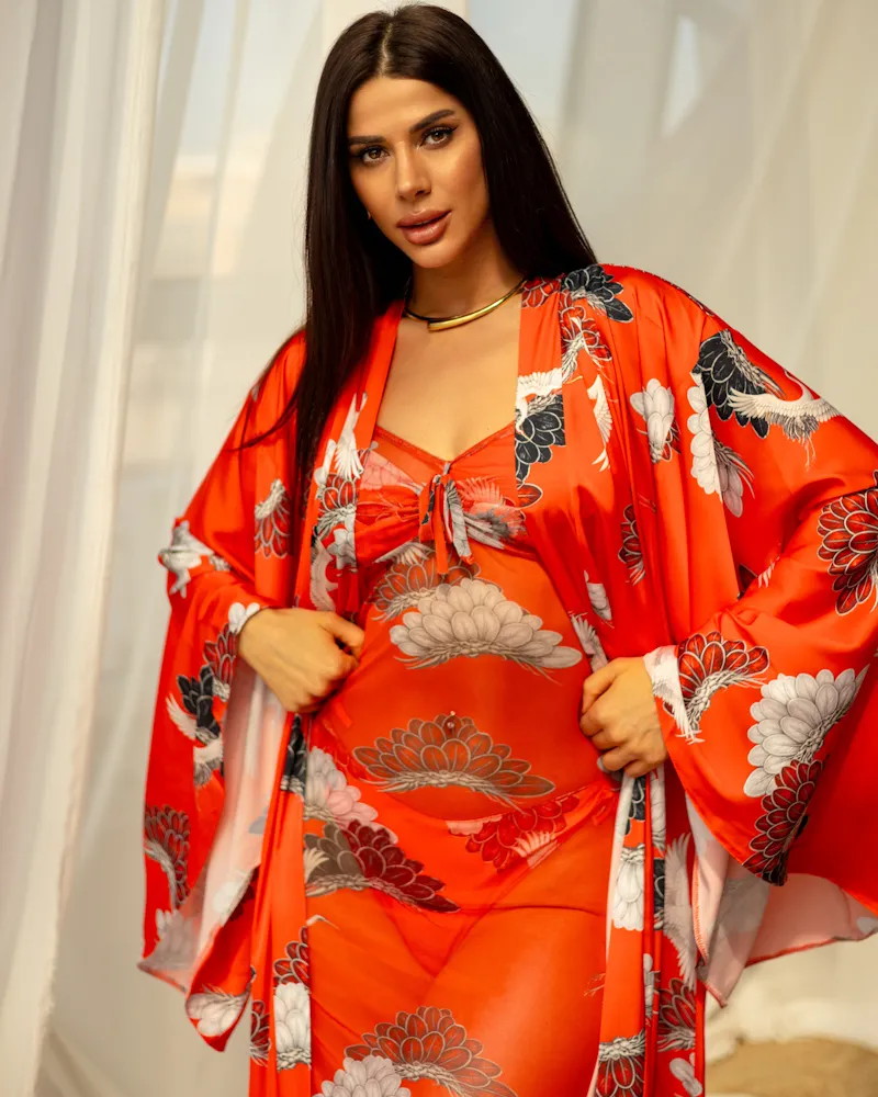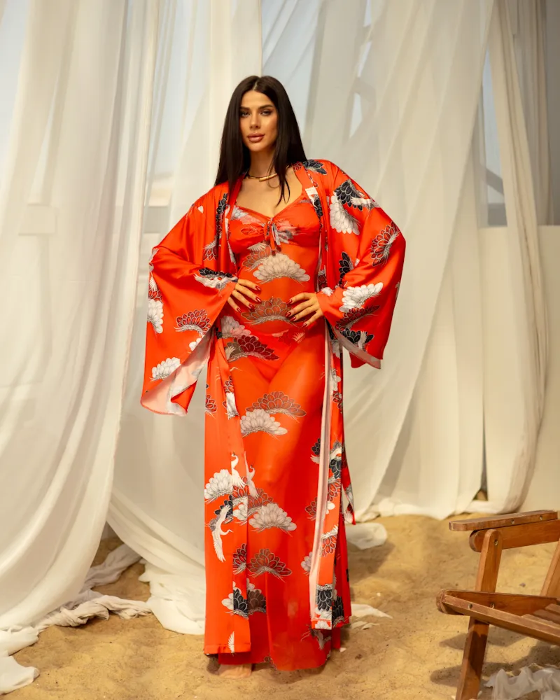 Стильний комплект із італійського шовку: довгий халат-кімоно, витончений купальник та косинка.