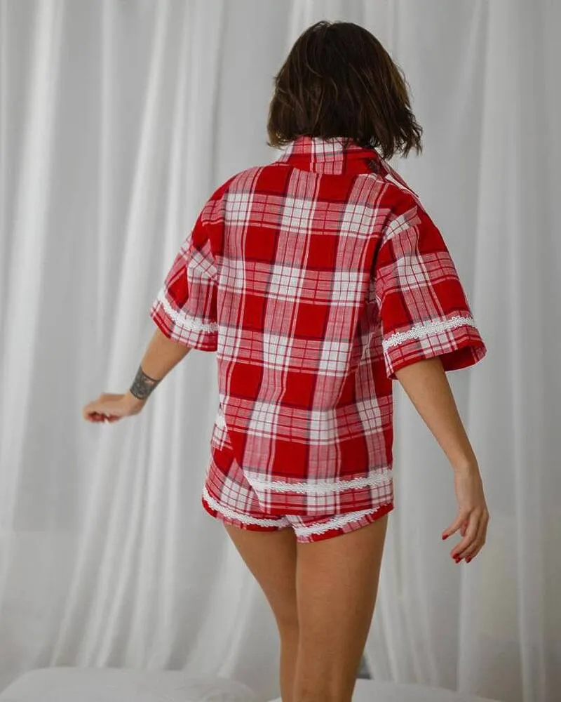 Головна / Каталог / Жінкам / Жіночий костюм / Жіночий костюм в піжамному стилі "Judy" бавовна преміум якості + італійське мереживо Червоний