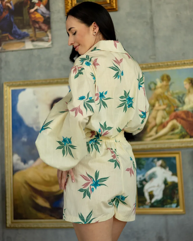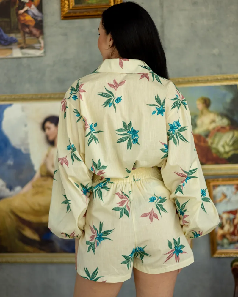 Модель складається з вільної сорочки з об’ємними рукавами та шортів із високою посадкою, які підкреслюють талію.