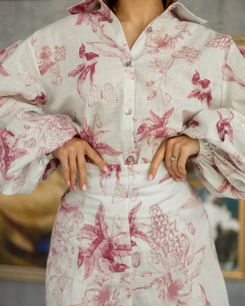 Льон забезпечує відмінну повітропроникність, добре вбирає вологу та дарує відчуття прохолоди у спекотні дні. Ніжний квітковий принт додає образу романтичності та елегантності, роблячи комплект ідеальним для літнього гардероба.