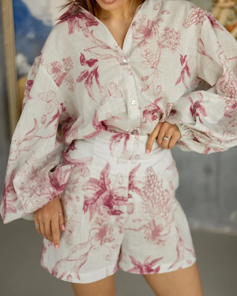 Модель складається з вільної сорочки з об’ємними рукавами та шортів із високою посадкою, які підкреслюють талію.
