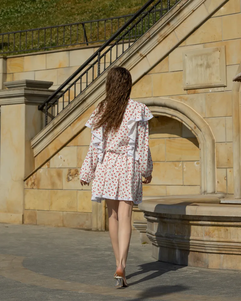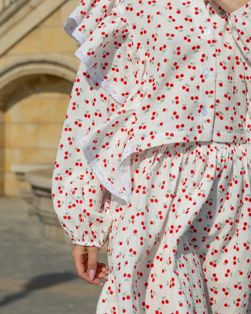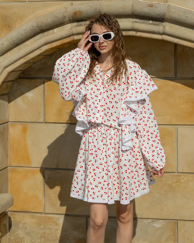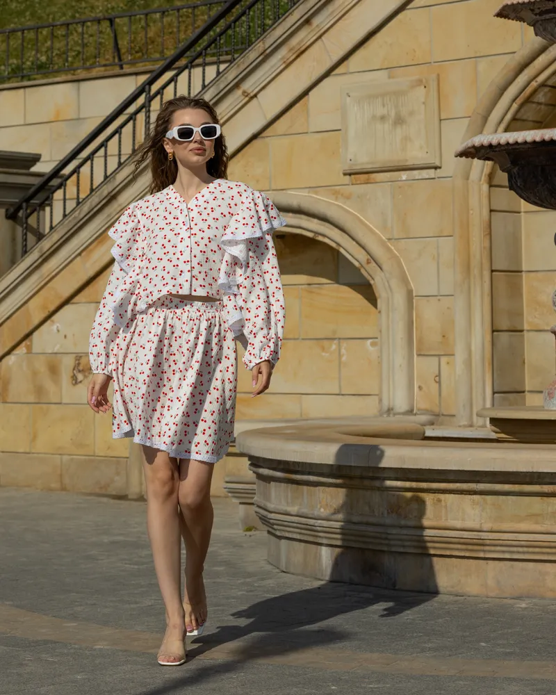 Комплект: укорочена сорочка на ґудзиках із довгими рукавами на резинці та воланами + спідниця на резинці із шортиками під низом.