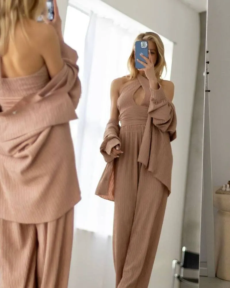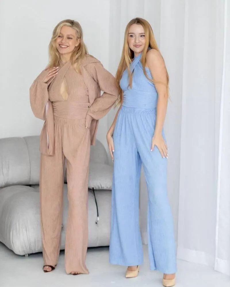 Комплект: сорочка на ґудзиках з манжетами, короткий топ із зав'язкою на шиї та вільного крою штани на високій посадці.