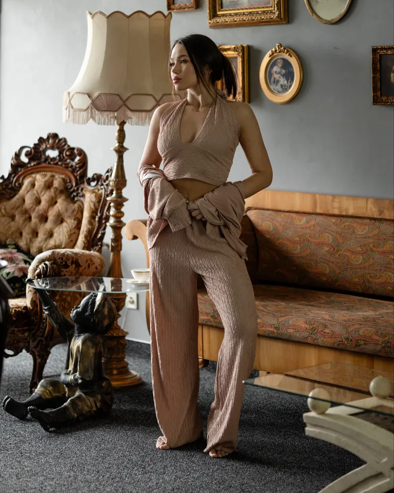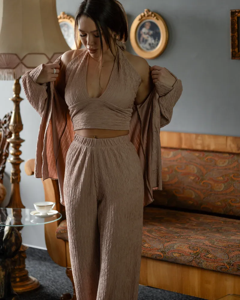 Головна / Каталог / Жінкам / Жіночий костюм / Жіночий костюм-трійка "Dominica" (сорочка+топ+штани) віскоза жатка Бежевий