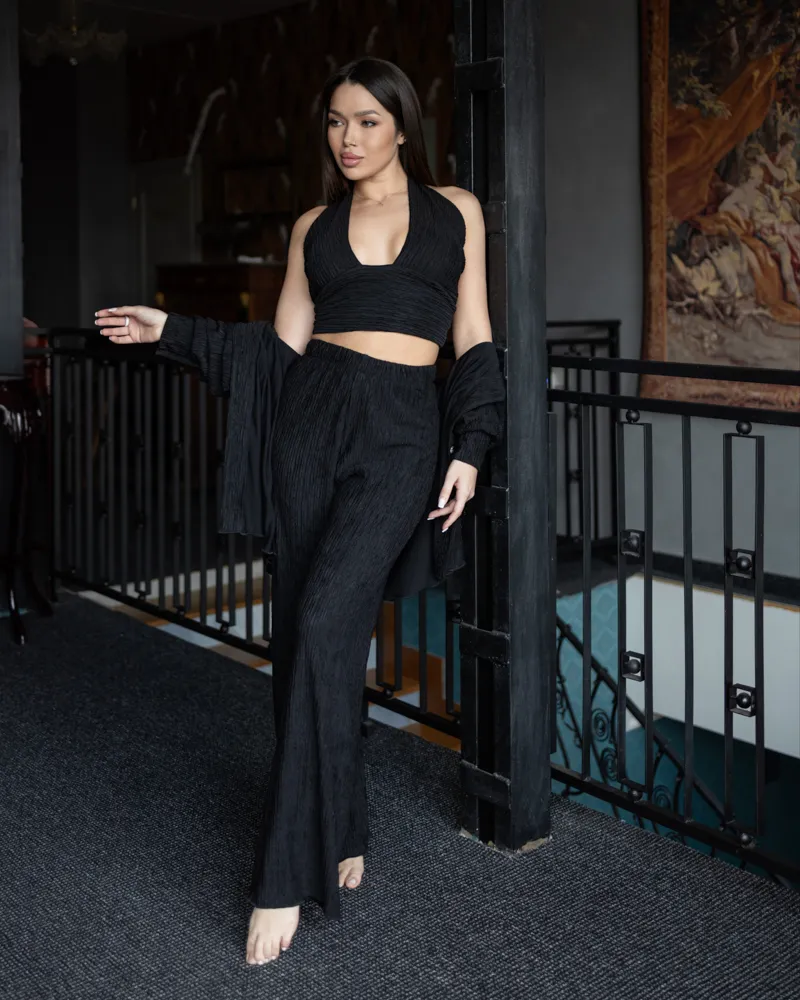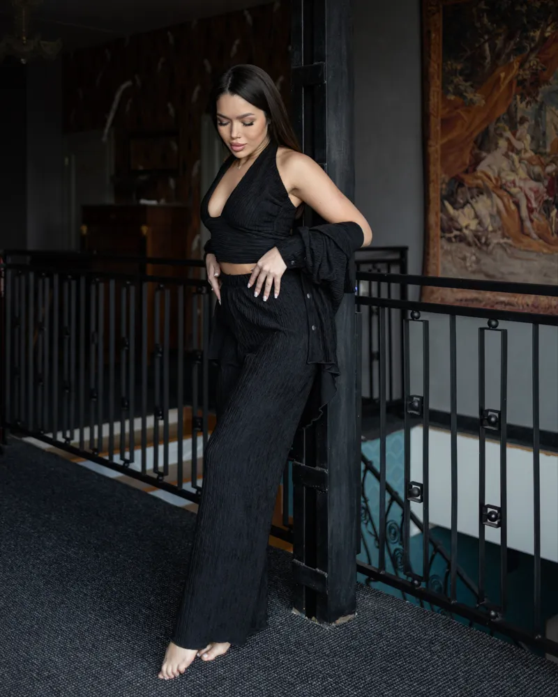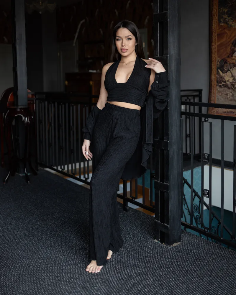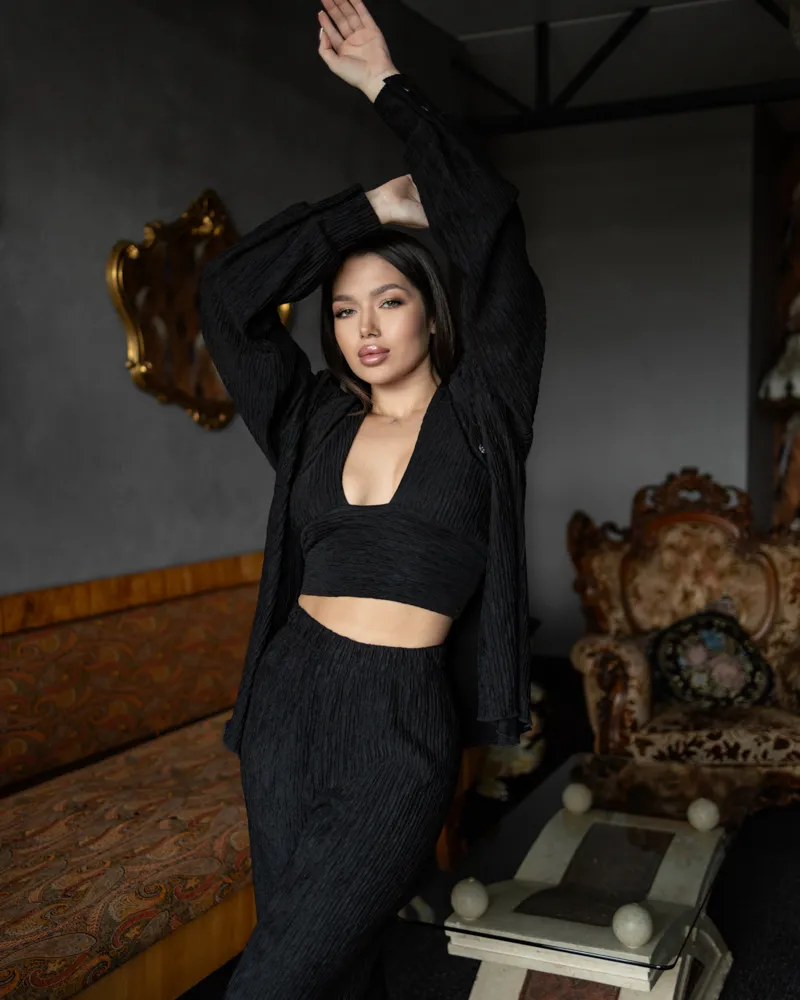 Головна / Каталог / Жінкам / Жіночий костюм / Жіночий костюм-трійка "Dominica" (сорочка+топ+штани) віскоза жатка Чорний
