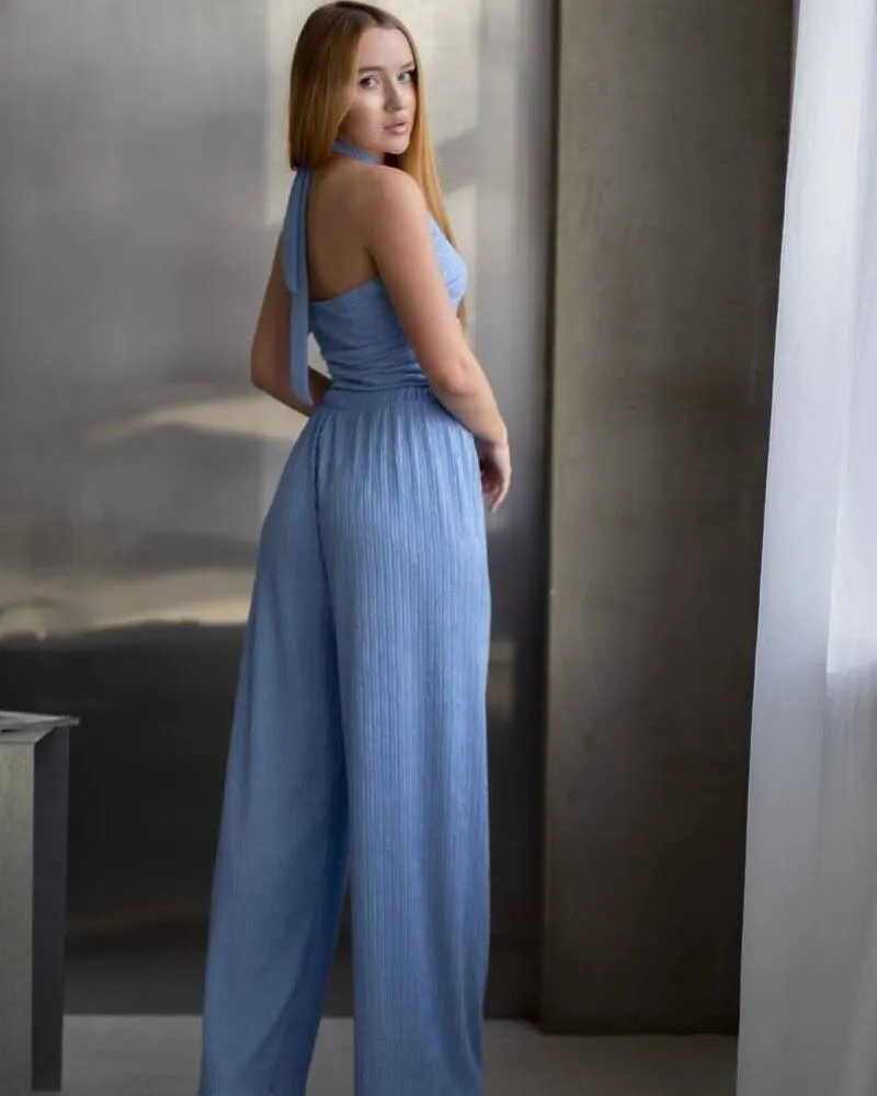 Комплект: сорочка на ґудзиках з манжетами, короткий топ із зав'язкою на шиї та вільного крою штани на високій посадці.