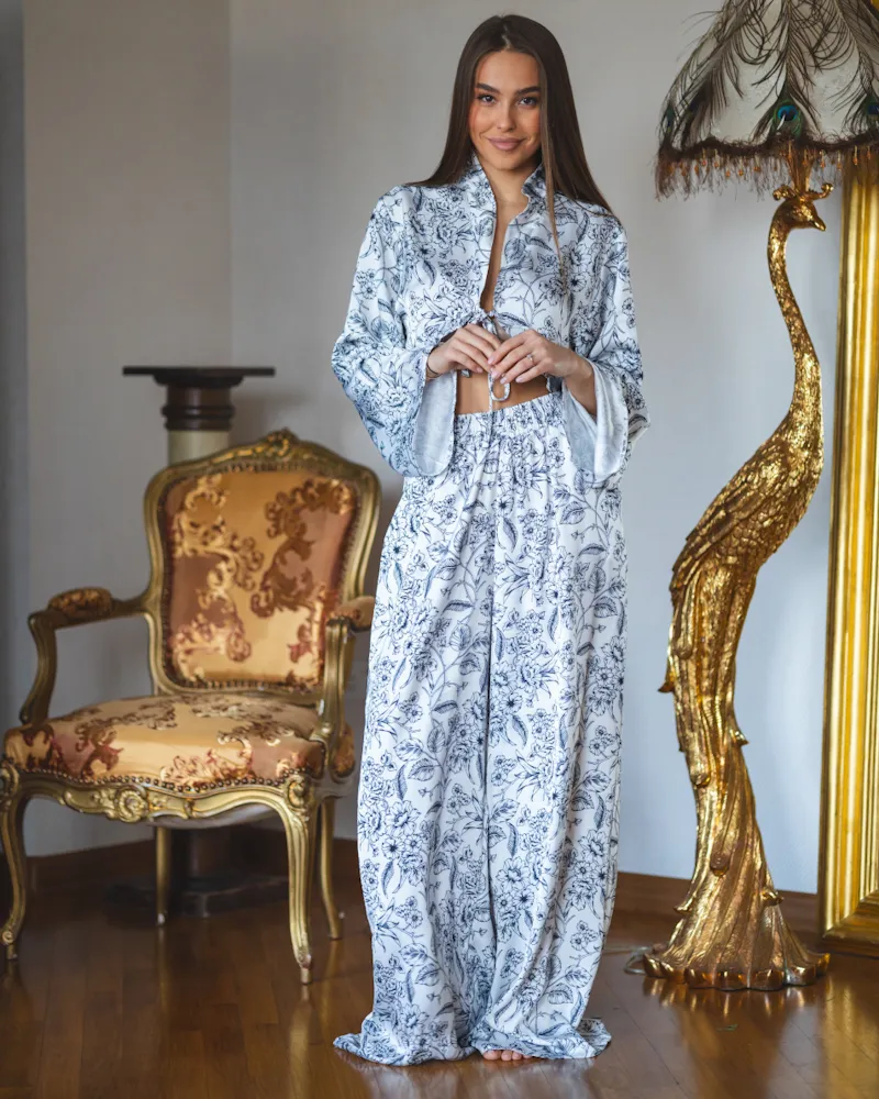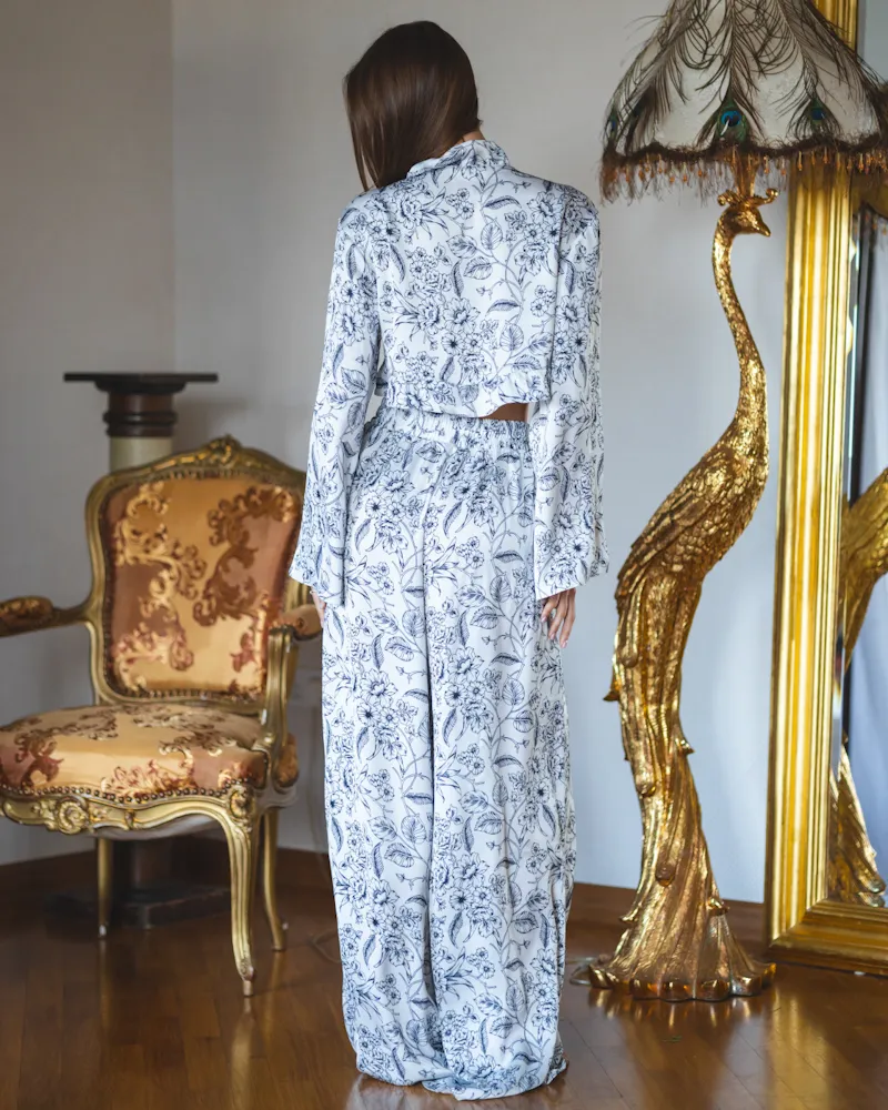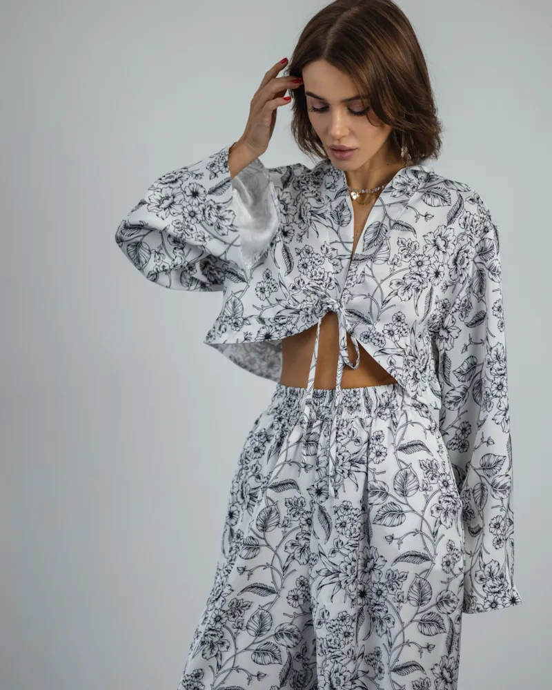Жіночий костюм-трійка з ніжної тканини шовк сатин дабл у рослинний принт.