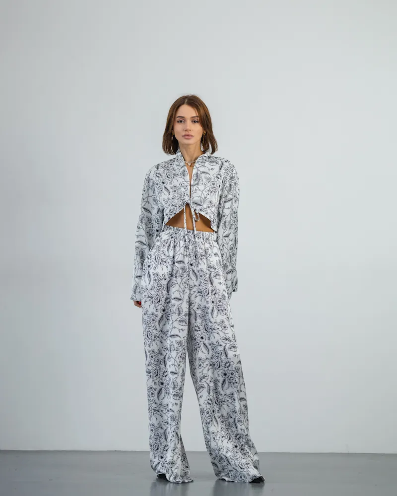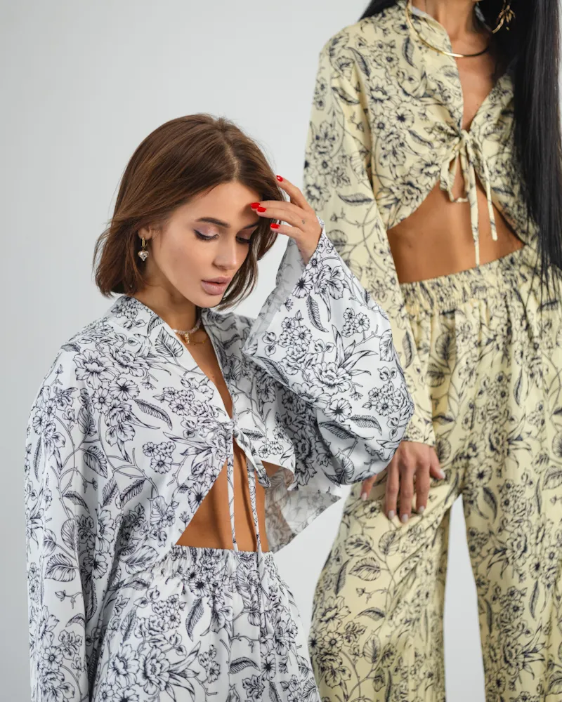 Комплект: коротка сорочка на зав'язці з широкими рукавами, вільного крою штани з кишенями та зручні шорти на резинці.